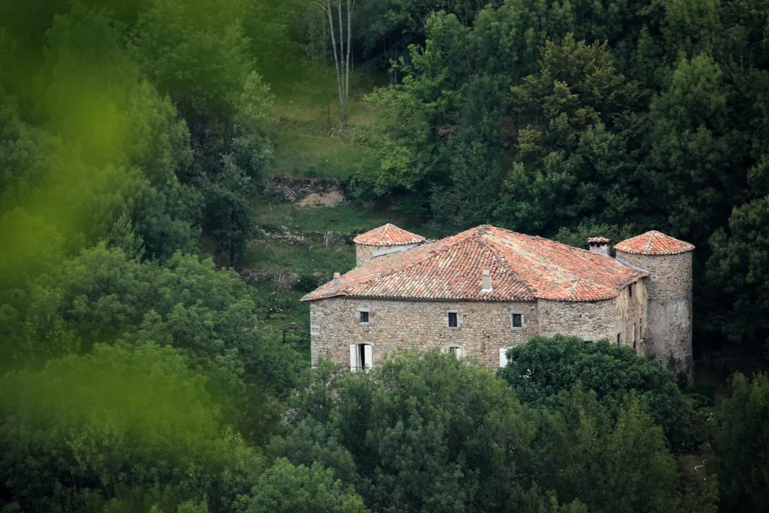 LE CHÂTEAU DU PIN AU FIL DU TEMPS Château du Pin- vue par drone - Photo Simon Bugnon Château du Pin- vue par drone – Photo Simon Bugnon Château du Pin (Fabras - Ardèche). Le Château du Pin (Fabras – Ardèche). Construit à flanc de colline par les Chanaleilles au 12ème siècle, remanié en 1591, le Château du Pin était une maison forte, à la fois lieu de défense et domaine agricole. À la Renaissance, le corps de bâtiment, carré, est flanqué de quatre tours d’angle rondes et surmonté d’une tour carrée. Un pigeonnier et des écuries complètent l’ensemble. L’édifice est bâti en grès rose et gris. Hormis les encadrements de portes et de fenêtres en pierre de taille, il est crépi. Porte Renaissance Porte Renaissance. Porte Renaissance, détail. Porte Renaissance, détail. Façade sud - Porte 15ème en accolade Façade sud – Porte 15ème siècle en accolade. Aujourd’hui, et vraisemblablement depuis le 18ème siècle, il conserve trois tours d’angle. La tour carrée est incluse dans le bâtiment. Du pigeonnier et des écuries, subsistent des murailles. Le crépi a disparu. Restent les pierres qui captent si bien la lumière. Sur la façade sud, au-dessus d’une porte en accolade du 15ème, le blason des Chanaleilles (trois lévriers courant l’un sur l’autre). L’entrée principale se fait par une porte dite à “fronton brisé”, typique de la Renaissance. Le fronton est supporté par deux piliers ornés de feuilles d’acanthe. Cette porte donne sur une tour où un escalier à vis dessert les trois niveaux. u rez-de-chaussée, ancrée à même le rocher, la salle des gardes, dallée en pierre, avec voûtes d’arrête supportées par des piliers, vaste cheminée à clé moulurée et les cuisines, avec voûte en berceau et cheminée à voussure. Deux dates y sont gravées : 1591 et 1592. Jouxtant la cuisine, la “souilllarde”, comprend un évier en pierre. Un passage, ouvert dans la tour de garde d’origine (12ème siècle), donne accès à d’autres pièces à voûtes en berceau et à une cavette appelée “la prison”. Le premier étage, hormis dans une petite tour à croisées d’ogive (pourvue de meurtrières), est plafonné à la française. Au sud, une galerie avec ouvertures 18ème et petite fenêtre 16ème à meneaux. Au levant, le salon – transformé en cabinet de curiosistés – comporte une petite cheminée du 16ème siècle à colonnettes. Le second étage, à l’exception de deux pièces installées dans des tours à meurtrières, également plafonnées à la française, se partage entre un appartement (un gîte) et un grenier.