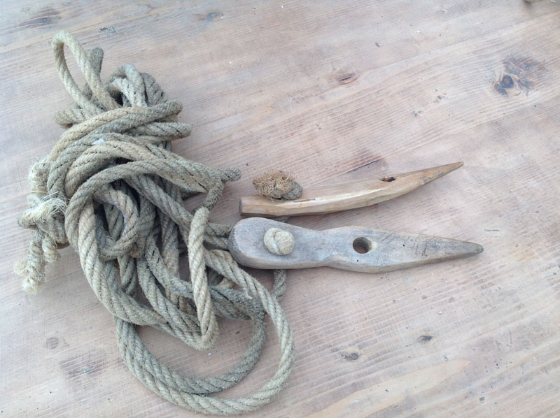Cordes à anelles, clef navette de serrage pour , après confection d'une énorme botte de foin, bloquer la corde de serrage et transporter à dos d'homme.3 cordes placées en paralelle pouvaient être utilisées pour serrer et transporter des bottes plus importantes sur les charettes.