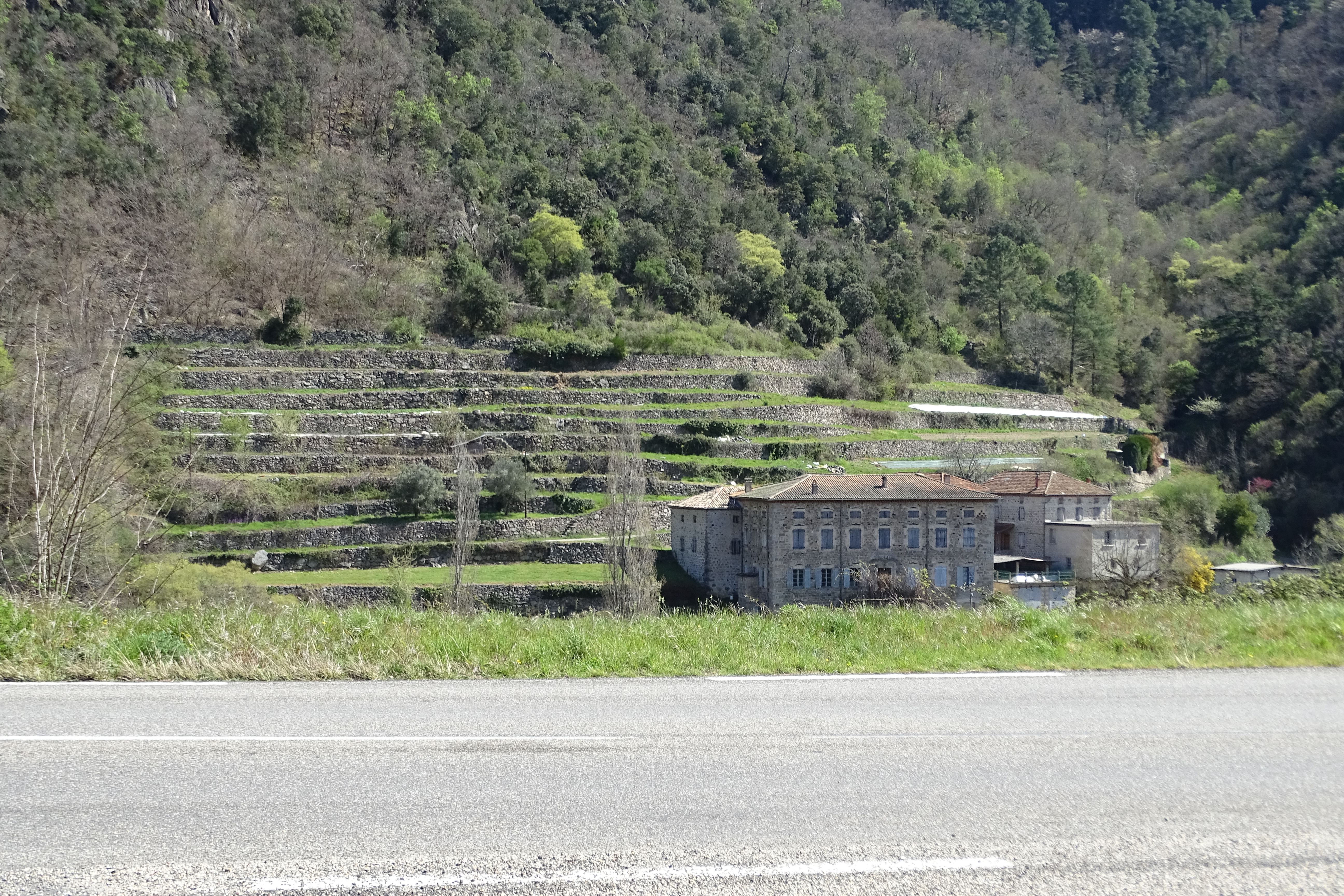Parcelles enterassées soulignant les traits de l'imposante bâtisse des Salhens. La hauteur des murs et le type d'appareillage sont caractéristique d'une exploitation agricole vivrière. Ces terrasses situées quelques mètres en surplomb de l'Eyrieux restent en partie toujours exploitées aujourd'hui encore.